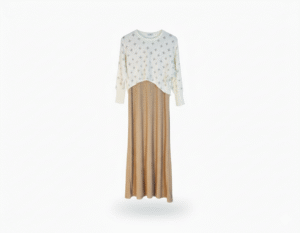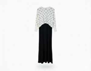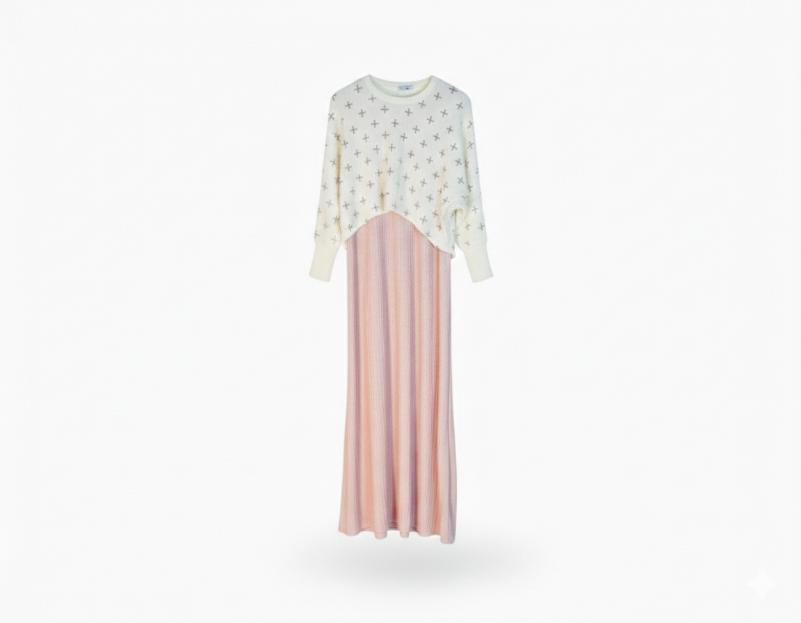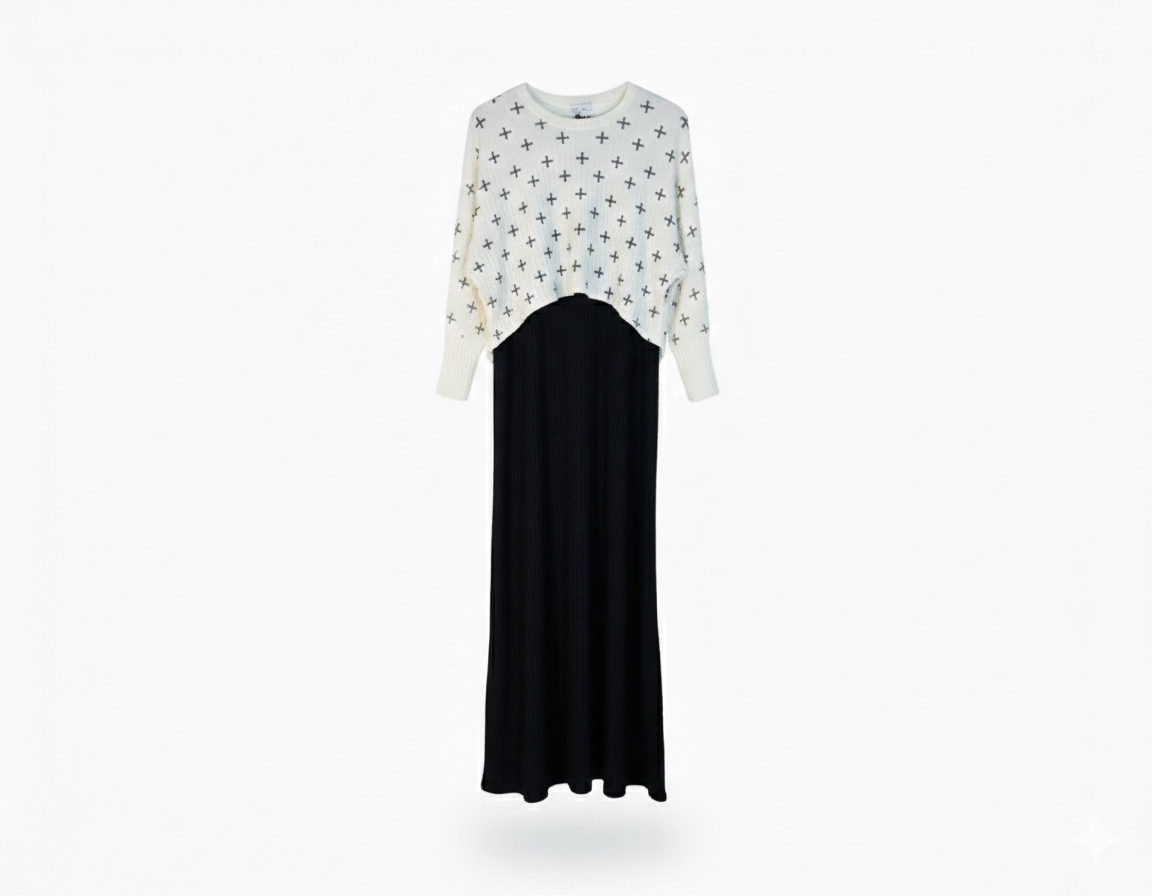The sweater is detailed with a delicate, minimalist cross-stitch pattern, offering a modern touch to a classic silhouette. Designed for comfort and elegance, it provides a complete, coordinated look in a single step—no extra layering required.