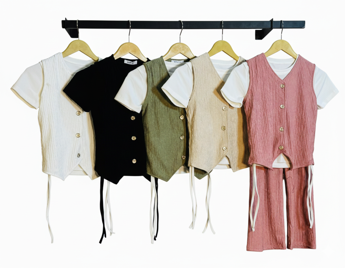 Discover your new favourite outfit for laid back style that doesn’t compromise on polish This versatile set combines a V neck sleeveless vest crafted from a soft textured ribbed knit fabric with a comfortable matching pair of wide leg trousers The vest features a playful slightly asymmetrical tie hem detail that adds a modern twist to a classic silhouette
